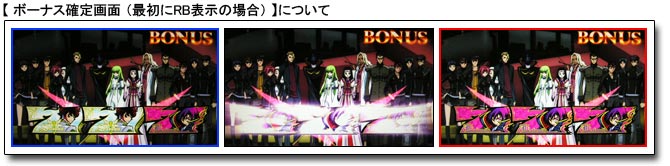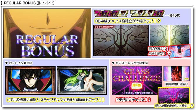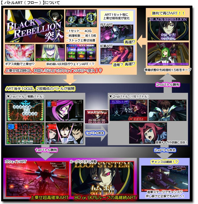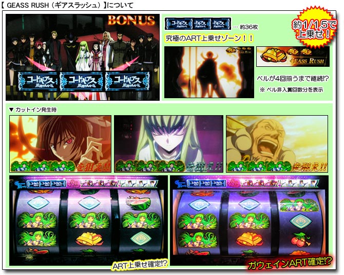 ![]() BAR図柄揃いの「GEASS RUSH(ギアスラッシュ:純増約36枚)」は、究極のARTストック上乗せゾーンの位置付けで、上乗せ確率はなんと約1/1.5という驚愕の数値。 ベル4回入賞まで継続する同ボーナス中は、超高確率でC.C.図柄揃いが成立し、平行でARTストック・斜めでガウェインART確定!?となる。 また、チャンス役やハズレでも上乗せ確定!? ![]() ボーナス確定画面でREGULAR BONUSが表示された場合、ギアスが発動すればBIG BONUSに昇格!? ![]() 「BIG BONUS(2種類:純増約214枚)」中は、C.C.図柄揃いでART確定となっているほか、チャンス役(液晶に表示)でもART当選のチャンス!? カットイン発生時は全リールにC.C.図柄狙いを実行しよう。(=カットインの種類で期待度を示唆) また、エピソードBB発生でART当選の期待大!? ![]() 「Premium BB」中は、新シリーズ「コードギアス 亡国のアキト」と連動した本機限定のムービーが展開! ![]() 「REGULAR BONUS(2種類:純増約40枚)」中は、チャンス役確率が大幅アップ!?となっており、扉が開けばART確定!? 消化中は、カットイン発生でレア小役当選のチャンス。カットインはステップアップするほど期待度もアップする仕組みだ。(=枠の色にも注目) また、RBは『ギアスチャレンジ』発生でARTストック上乗せの大チャンス。 PUSHボタンを連打し、開いた扉の数だけARTストック上乗せ!? その際、扉奥の背景色で扉が開く期待度を示唆しているので注目してみよう。(期待度:青<赤<レインボー) ![]() 「バトルART」のフローは上記の通りで、まず待機状態からスタート。 待機状態中は、押し順ナビに従って消化し「ベル・チェリー・チェリー」入賞でARTがスタート。 ARTは1セット40G・1Gあたりの純増枚数約1.5枚で、ストック上乗せ抽選(C.C.図柄揃いで上乗せ確定・チャンス小役で上乗せ抽選)を行っており、上乗せ成功時は1/5以上で次回【ガウェインART】となる。 またARTは、後半10Gに渡り『1stバトル(戦略バトル)』・「2ndバトル(1対1バトル)」が展開し、勝利することでART継続確定となるのだが、『1stバトル』で勝利すると【ガウェインART(上乗せ超高確率ART)】もしくは【ループシステム(80 or 90%ループART)】突入となる。 なお「2ndバトル」で敗北してしまった場合でもARTのチャンスは残されており、「進軍ステージ」でチャンス!?、「自力で掴み取れ!!」の「???」ナビが発生した場合は、6択の押し順正解でART復帰となる。(=正解時は「ベル・チェリー・チェリー」・不正解時は「リプレイ・リプレイ・ベル」が入賞) ![]() 【ガウェインART】は“上乗せ超高確率ART”となっており、ARTストックの当選率が大幅にアップ。 押し順ベルでも約1/5で上乗せするほか、チャンス役ならば大チャンスとなる。 また、同ART中のボーナス当選は激アツ!? ![]() 【ループシステム】が始動した場合は、バトルARTが80 or 90%のループ率で継続。 通常のバトルARTの継続システムは「セット数継続」なのに対し、このループシステムが発動することにより『継続率』が加わるということになる。 つまり、ループ率に当選し続ける限り、ストックを減らすことなくARTが継続していくということだ。 (C)SUNRISE/PROJECT GEASS・MBS Character Design (C)2006 CLAMP (C)NAMCO BANDAI Games Inc. (C)Sammy |